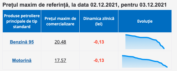 Așadar, Agenția Națională pentru Reglementare în Energetică anunță ieftiniri care vor intra în vigoare de mâine, 3 decembrie. Atât benzina cât și motorina scad din preț câte 13 bani, astfel că prima se va comercializa la un preț maxim de 20.48 lei, iar cea din urmă cu 17.57 lei per litru.