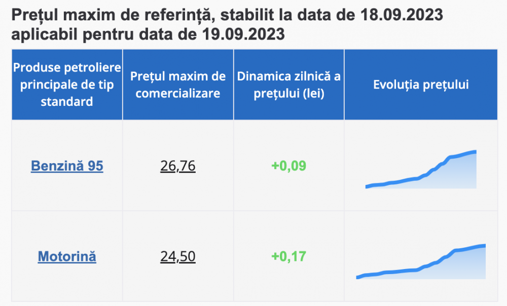 Pentru 19 septembrie, ANRE a stabilit noi prețuri. Astfel, pentru un litru de benzină, vom achita 26.76 lei, după un plus de 9 bani. Între timp, motorina devine și ea mai scumpă. După ce adaugă în preț 17 bani, proprietarii de mașini diesel vor achita 24.50 lei pentru un litru de combustibil.