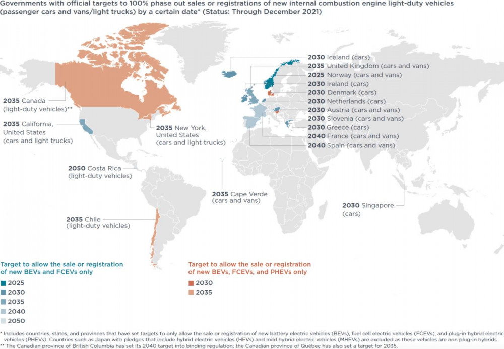Spre exemplu în SUA, doar democrații și liberaliștii din California vor să comercializeze doar EV-uri din 2035. Pe piețile din Australia, China, toate țările din Asia și Orientul Mijlociu, dar și cele din Africa nu sunt de acord cu vehiculele electrice drept o alternativă celor cu motoare cu ardere internă.