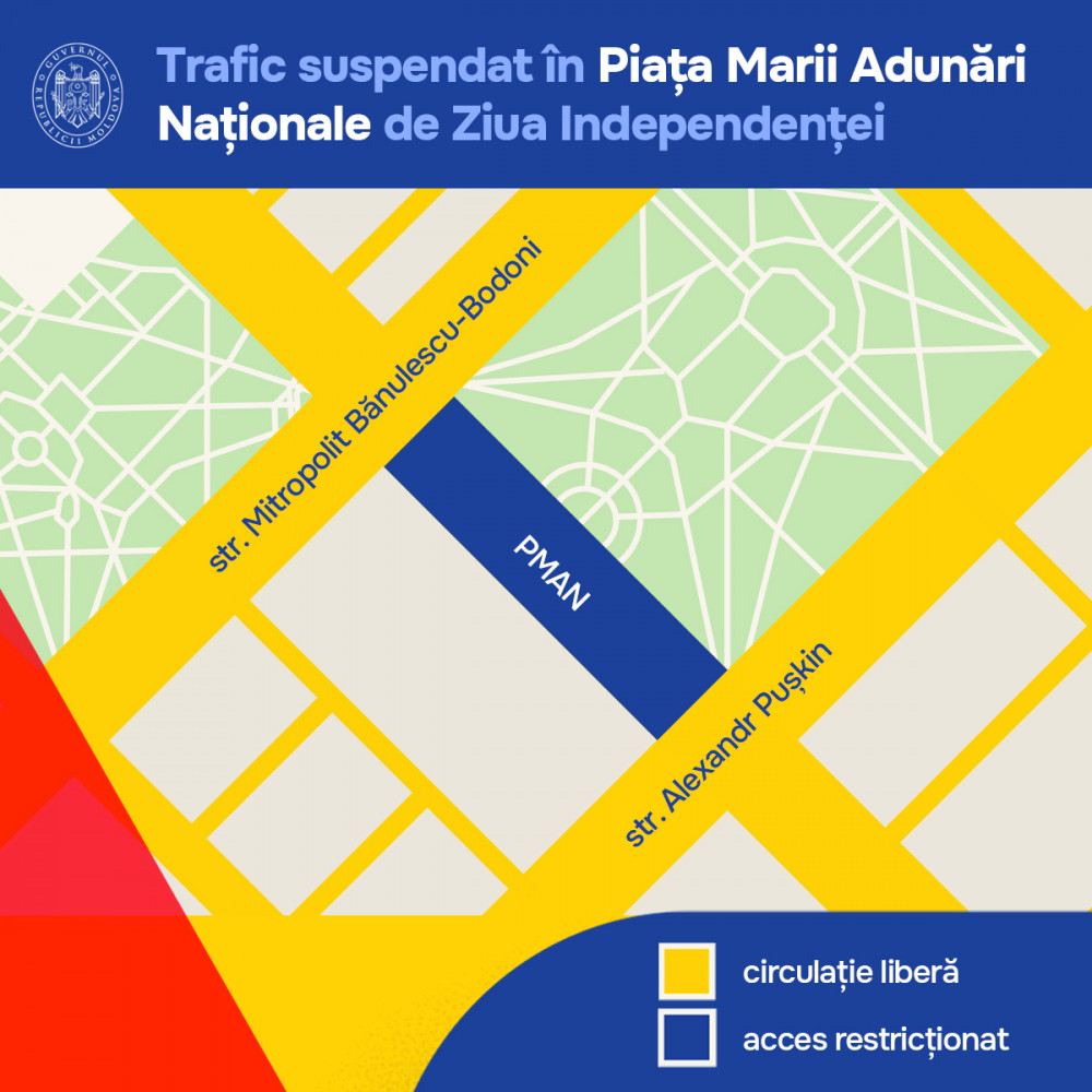 Menționăm că sistarea traficului rutier este motivată de organizarea manifestărilor cultural-artistice consacrate Zilei Independenței Republicii Moldova.