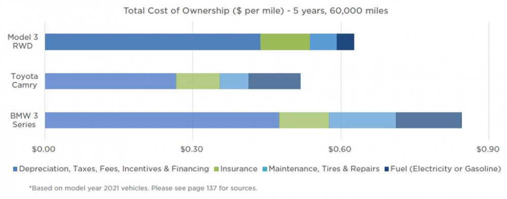 E mai costisitor oare să deții în proprietate un EV? Tesla Model 3 comparată cu Toyota Camry și BMW Seria 3