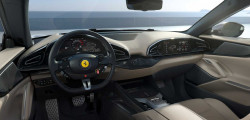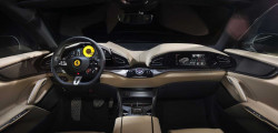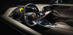 Pe interior, constructorul a optat pentru maximă digitalizare. Acum este montat și un ecran digital în partea pasagerului. De asemenea putem vedea un instrumentar digital de 10.25 inch, alături de un ecran separat și de dimensiuni similare amplasat direct deasupra torpedoului, alături de comenzi tactile în zona centrală. Ce ține de scaune, pentru prima dată au fost montate 4 scaune la un model de serie Ferrari. Toate sunt reglabile electric și sunt chiar încălzite și pentru pasagerii din spate și desigur că sunt îmbrăcate în piele.