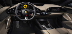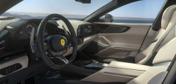 Pe interior avem spațiu generos și patru locuri. Apropo, trebuie să remarcăm că mașinile din spate se deschid în sens opus, fapt care oferă un acces mult mai ușor. O altă noutate este că motorul lui Purosangue este amplasat foarte aproape de zona habitaclului, iar cutia de viteze este amplasată în spate. În acest context, Ferrari a reușit să obțină o distribuție a greutății de 49/51 față-spate.