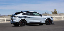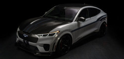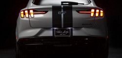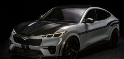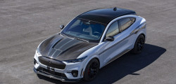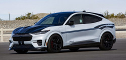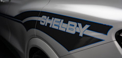 Primul model electric poartă numele Shelby Mustang Mach-E și urmează să fie construit în doar 100 de exemplare, pentru a marca cei 100 de ani de la nașterea lui Carroll Shelby, fondatorul companiei. Dacă să comparăm cu versiunea obișnuită, Shelby aduce un exterior mai agresiv și o nuanță exterioară exclusivă. Este o nuanță de alb acompaniată de o grafică specială în părțile laterale.