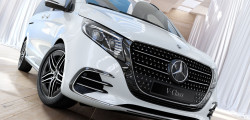 În premieră, utilitara de la Mercedes are sigla producătorului montată pe capotă, exact ca și la celelalte modele din gamă. Doar că, ornamentul siglei va fi disponibil doar pentru modelul standard V-Class în echiparea Exclusive. Iar pe lângă noul ornament, V-Class și celelalte modele derivate primesc o grilă nouă cu un design mai impunător. În cazul celorlalte echipări, sigla Mercedes-Benz este încorporată și pe grilă.