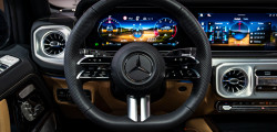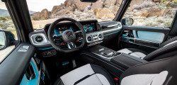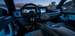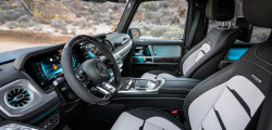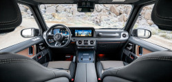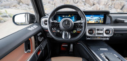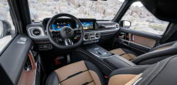 Interiorul noului Mercedes-Benz Clasa G facelift vine cu un volan nou îmbrăcat în piele Nappa, cea mai recentă versiune a sistemului de iluminare ambientală și sistemul MBUX, care include un instrumentar de bord digital și un ecran central pentru sistemul multimedia, ambele cu o diagonală de 12.3 inch.