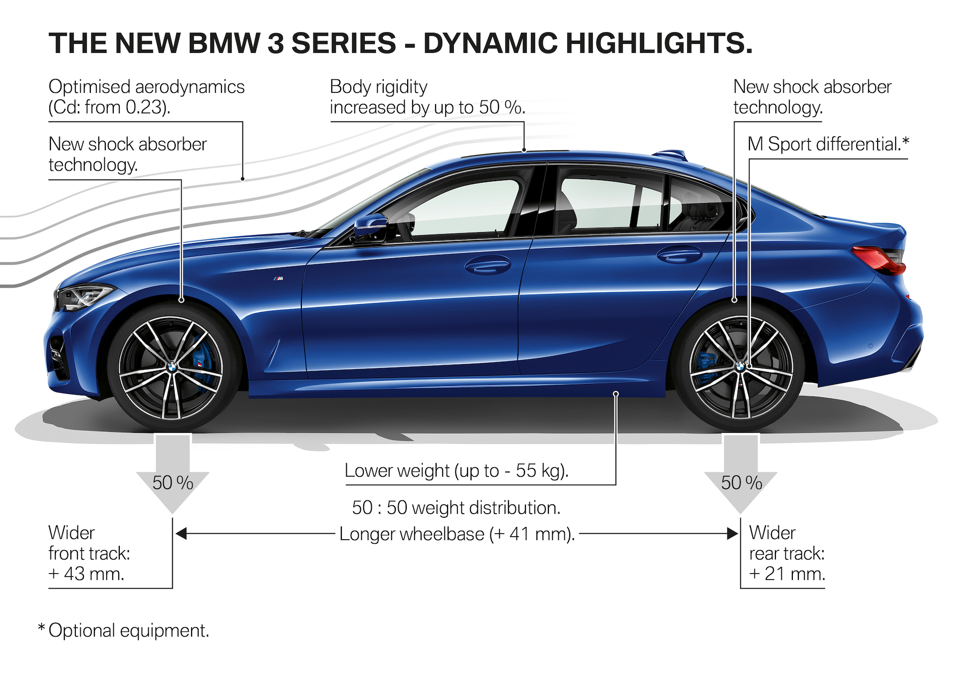 Sedanul german măsoară 4.709 milimetri în lungime (+76mm comparativ cu generația precedentă), 1.827 mm lățime (+ 16 mm) iar ampatamentul ajunge la 2.851 milimetri (+ 41), dar cu toate astea centrul de greutate a coborât cu aproximativ 10 milimetri, distribuția maselor între punți este de 50:50, rigiditatea șasiului a crescut cu aproximativ 25%, iar masa totală a fost redusă cu 55 de kilograme!