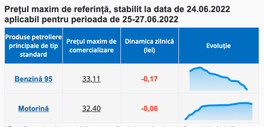 Așadar, în perioada 25-27 iunie, benzina se ieftinește cu 17 bani și ajunge să coste cel mult 33.11 lei, în timp ce motorina scade din preț 6 bani și se va comercializa nu mai scump de 32.40 lei!