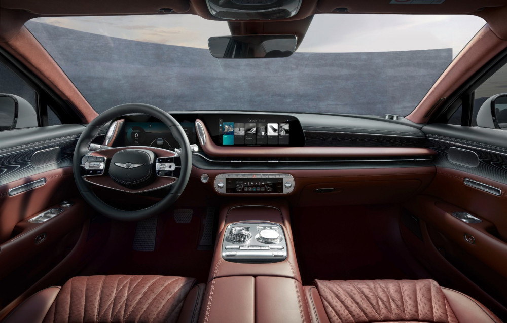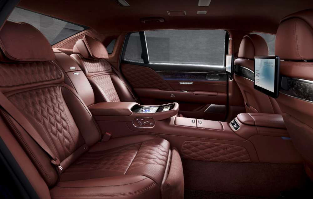 La interioe G90 este proiectat și dotat în stilul specific unei limuzine premium, cu elemente cromate, inserții din lemn și chiar de sticlă. Cel din urmă se regăsește pe consola centrală a mașinii, unde observăm comenzile pentru închiderea automată a ușilor, precum și senzorul de amprentă pentru pornirea motorului. G90 este dotat cu mai multe ecrane, având un ecran digital al instrumentarului de bord, un ecran central pentru sistemul multimedia, dar și display-uri de 10.2 inch montate în tetierele față, pentru pasagerii din spate. Nu în ultimul rând, este prezent și un ecran de 8 inch integrat în consola centrală.
