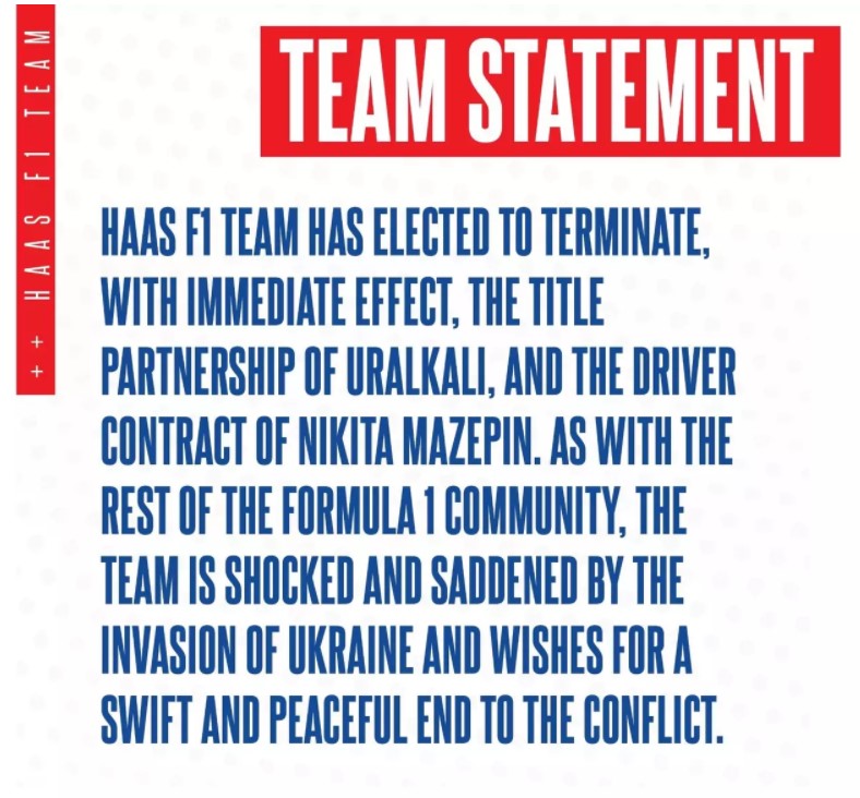 Echipa Haas a decis să rezilieze contractul cu pitolul Nikita Mazepin, despre acest fapt reprezentanții au anunțat printr-un mesaj pe Twitter. De asemenea, ei au refuzat să conlucreze și cu sponsorul principal, Uralkali.