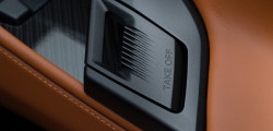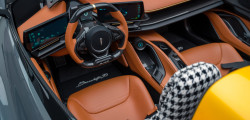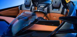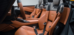 În interior, în mare parte, regăsim piele maro deschis, doar tetierele scaunelor sunt vopsite într-o combinație de alb și negru care imită un steag în carouri. Sunt prezente și ornamente decorative din aluminiu, dar și suprafețe de sticlă pentru șofer și pasager, care sunt reglabile electric pentru a modifica fluxul de aer în habitaclu.