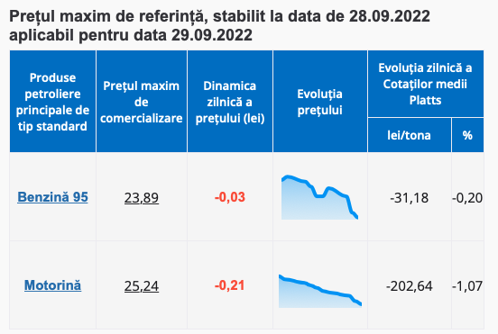 Așadar, mâine, 29 septembrie, benzina se va ieftini cu încă 3 bani și va ajunge să coste cel mult 23.89 lei, în timp ce motorina scade din preț 21 de bani și se va comercializa nu mai scump de 25.24 lei per litru!