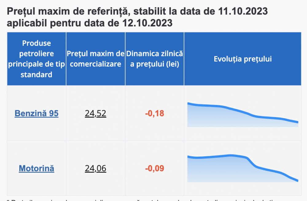 Pentru ziua de mâine, ANRE a stabilit noi prețuri plafon pentru combustibili. Astfel, după o ieftinire cu 18 bani, benzina va fi comercializată cu 24.52 lei.