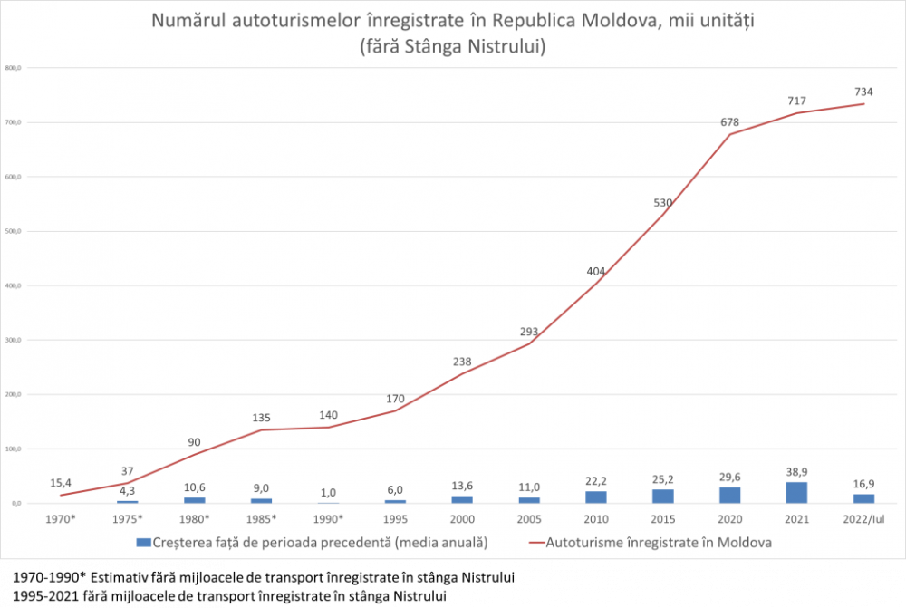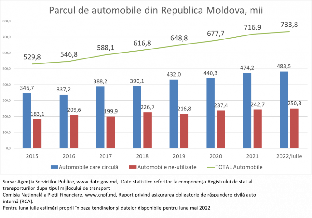 La 1 august 2022 în Republica Moldova erau înregistrate 734 mii automobile, în creștere cu 16.9 mii față de anul 2021. În acest an, lunar, în Moldova numărul automobililor înregistrate crește cu 2.100, cea ce este cu 25% mai puțin decât în anul 2021, când a fost înregistrat o creștere record a numărului de automobile de 38.900 sau câte 3.200 lunar, informează expertul Veaceslav Ioniță.