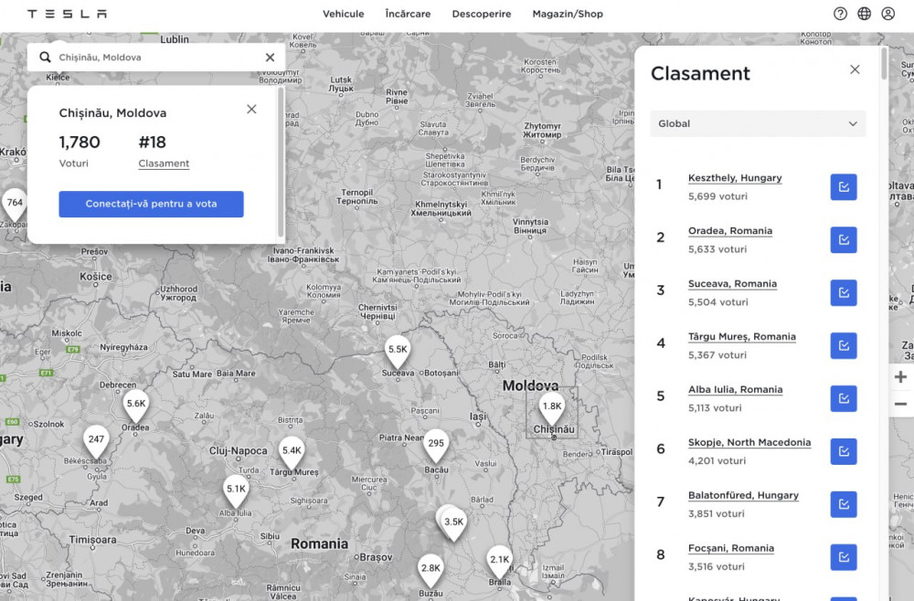 La momentul actual, Chișinăul ocupă poziția 18 în clasamentul votului. În fruntea listei se află o locație din Ungaria, urmată de mai multe din România. Moldovenii au o oportunitate semnificativă de a-și face vocea auzită și de a contribui la extinderea rețelei Supercharger prin participarea activă la această campanie.