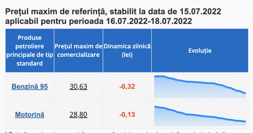 Începând cu ziua de mâine, 16 iulie, un litru de benzină va deveni mai ieftin cu 32 de bani și va avea prețul final de 30.63 lei. Între timp, motorina de asemenea înregistrează scăderi cu 13 bani, având un preț maxim de 28.80 lei.