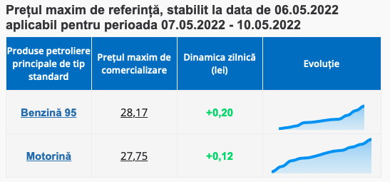 ANRE, a publicat câteva minute în urmă noile prețuri plafon pentru perioada 7-10 mai. Potrivit acestora , benzina se scumpește cu 20 de bani și ajunge să coste 28.17 lei, în timp ce motorina adaugă la cost 12 bani și se va comercializa cu maxim 27.75 lei