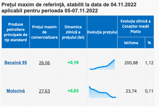 Astfel, în zilele de weekend și luni, benzina va avea un preț care crește cu 19 bani și ajunge să fie de maxim 26.06 lei per litru, în timp ce motorina se scumpește cu 3 bani și se va comercializa cu cel mult 27.63 lei per litru.