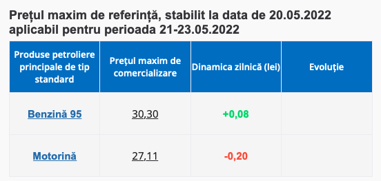 Așadar, în perioada 21-23 mai, benzina va costa cu 8 bani mai scump, adică 30.30 lei, în timp ce motorina scade din preț 20 de bani și se va comercializa la pompă cu maxim 27.11 lei!