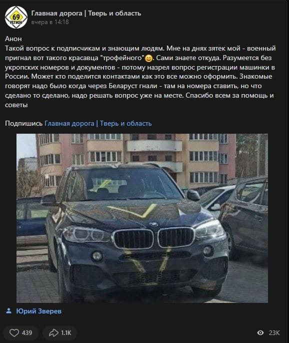 Recent, pe un grup de automobiliști de pe rețeaua de socializare rusească vk.com, a apărut o postare care te lasă fără cuvinte. În ea, autorul întreabă cum poate înregistra mașina, un BMW, ” care a fost adus de către ginerele său în calitate de trofeu”.