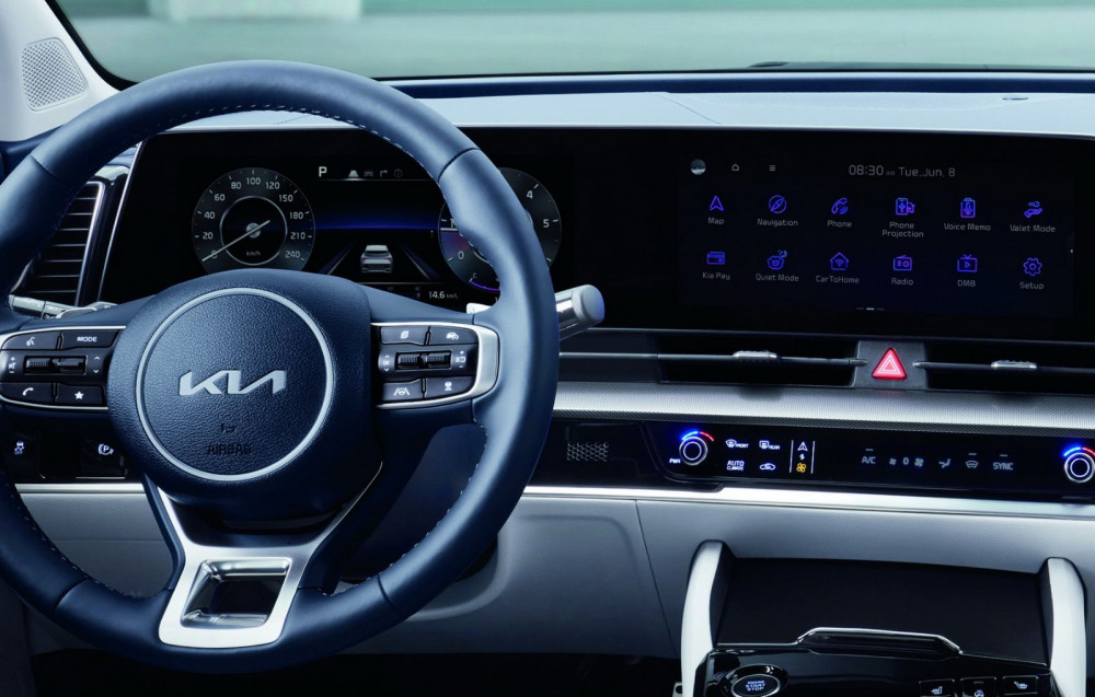 Coreenii au regândit consola centrală, iar un display curbat de dimensiuni generoase integrează instrumentarul digital de bord și sistemul media.