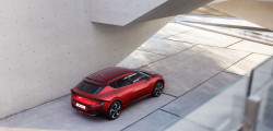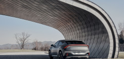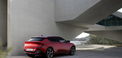 Lateralele prezintă o siluetă inspirată de crossovere - modernă, elegantă și aerodinamică. Proiectanții au păstrat vie în minte funcționalitățile aerodinamice la proiectarea EV-ului. În spate, montanții C sunt poziționați sub un unghi specific, funcțional, capabile să optimizeze fluxul de aer aderent și să reducă turbulențele. În continuare, un spoiler proeminent canalizează aerul în jos, de unde este redirecționat către un altul, inferior.