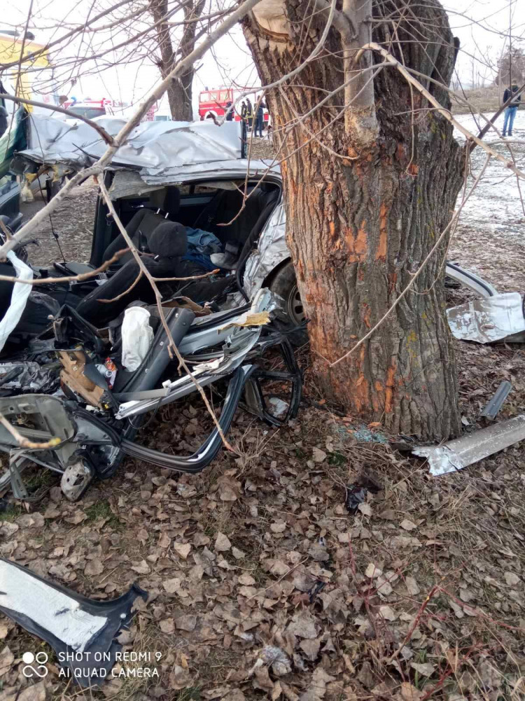 În urma impactului, mașina a fost făcută zob, femeia de la volam a decedat pe loc, iar doi pasageri au fost transportați al spital, unul dintre care se află în comă.