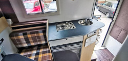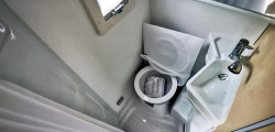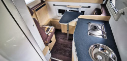 Locatarii acestui motorhome vor găsi chiar și cabina de duș, o mini garderobă, priză la 220V, porturi USB boiler cu un volum de cinci litri, un rezervor pentru apă curată de 70 de litri și încă unul pentru deșeuri de 40 de litri.