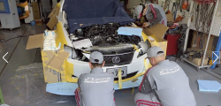 Liniile fluide originale ale lui Lexus IS au fost înlocuite cu un kit de caroserie, aproape brutal, vopsit într-o nuanță de gri Destroyer Gray, cunoscută de la Chrysler. Partea frontală este dominată de o priză de aer uriașă, atât de proeminentă încât controversata grilă „spindle” de la Lexus pare, prin comparație, surprinzător de elegantă.