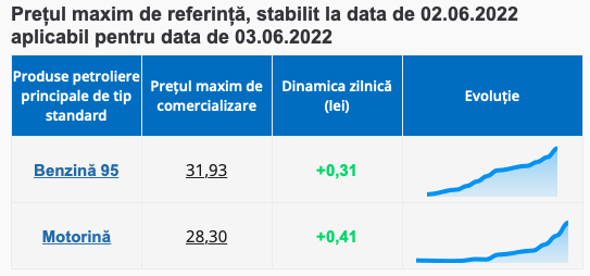 Așadar, Agenția anunță că mâine, 3 iunie, benzina se va scumpi cu 31 de bani și va ajunge să se comercializeze cu maxim 31.93 lei. În același timp, motorina adaugă la cost tocmai 41 de bani și se va vinde la pompă cu cel mult 28.30 lei!