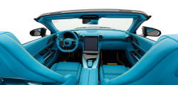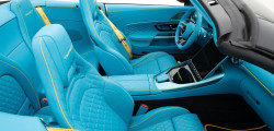 Cu toate acestea, interiorul este cel care atrage cu adevărat atenția, datorită prezenței piele albastre în aproape toate zonele, completată de cusături contrastante galbene.