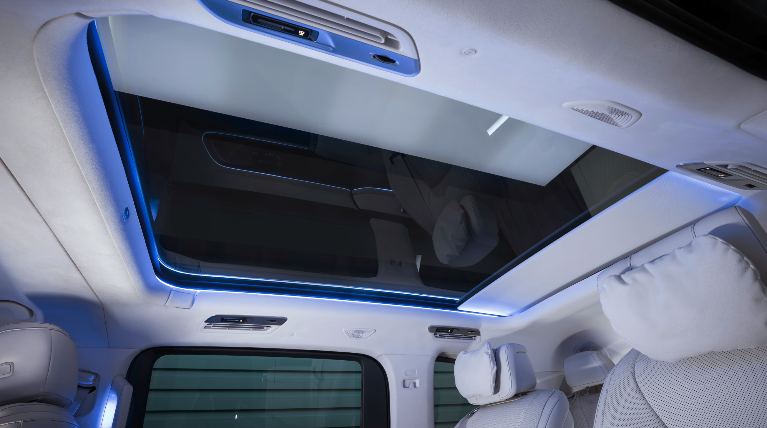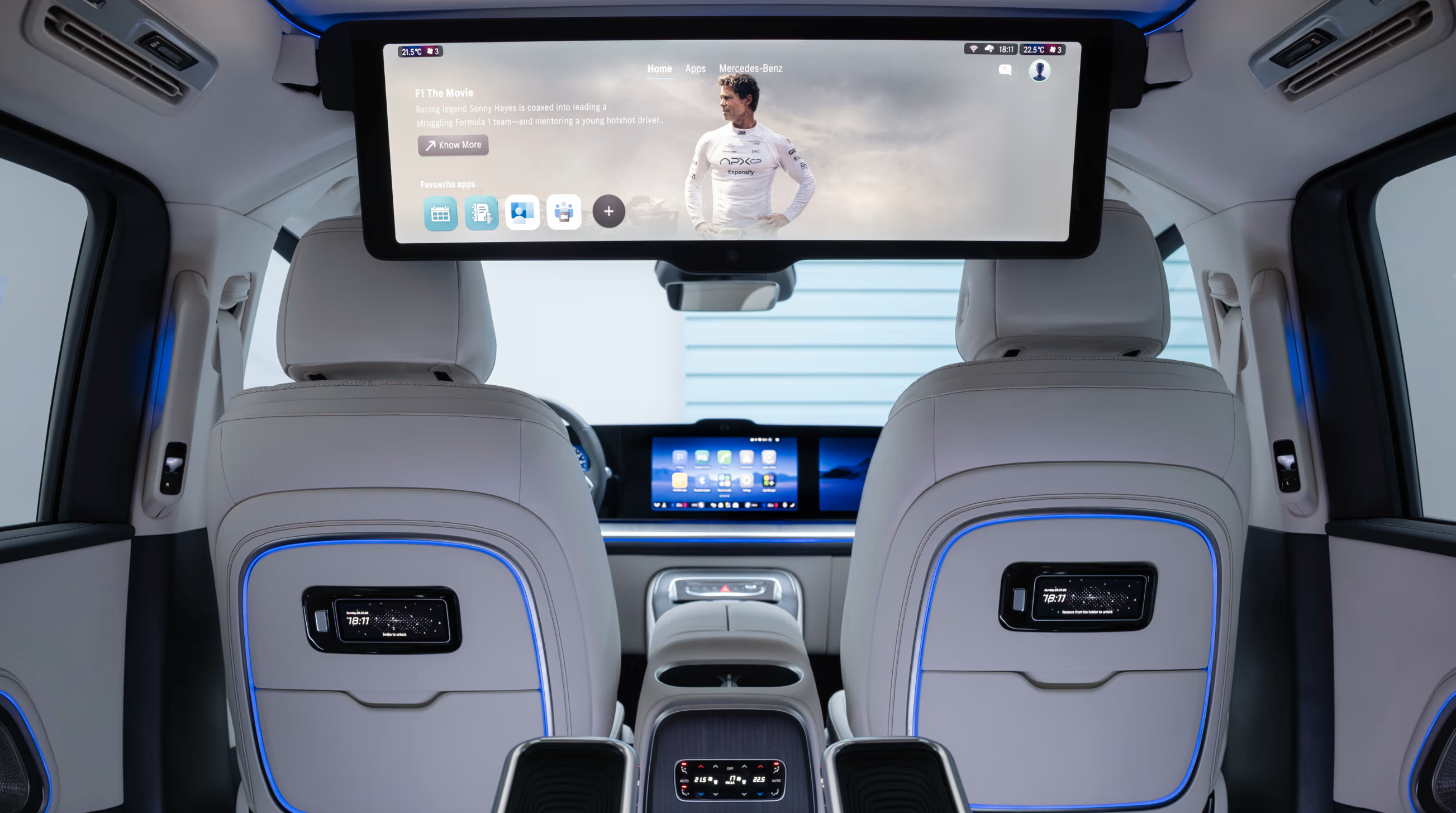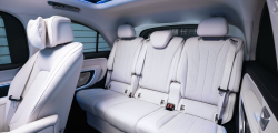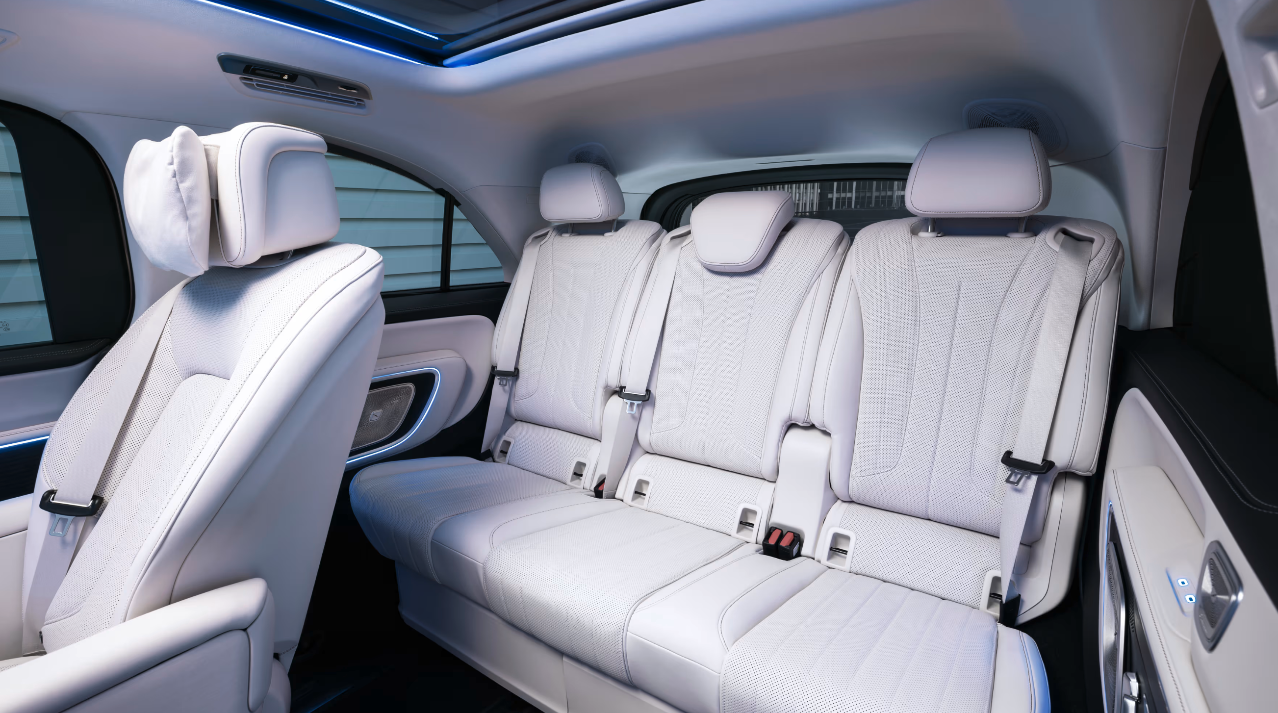 În spate, experiența devine și mai exclusivistă. Un ecran panoramic de 31.3 inch cu rezoluție 8K "coboară" din plafon, similar cu sistemul disponibil pe BMW 7 Series. Acesta poate fi utilizat pentru videoconferințe sau pentru vizionarea filmelor, fiind completat de un sistem audio Burmester cu 22 de difuzoare.