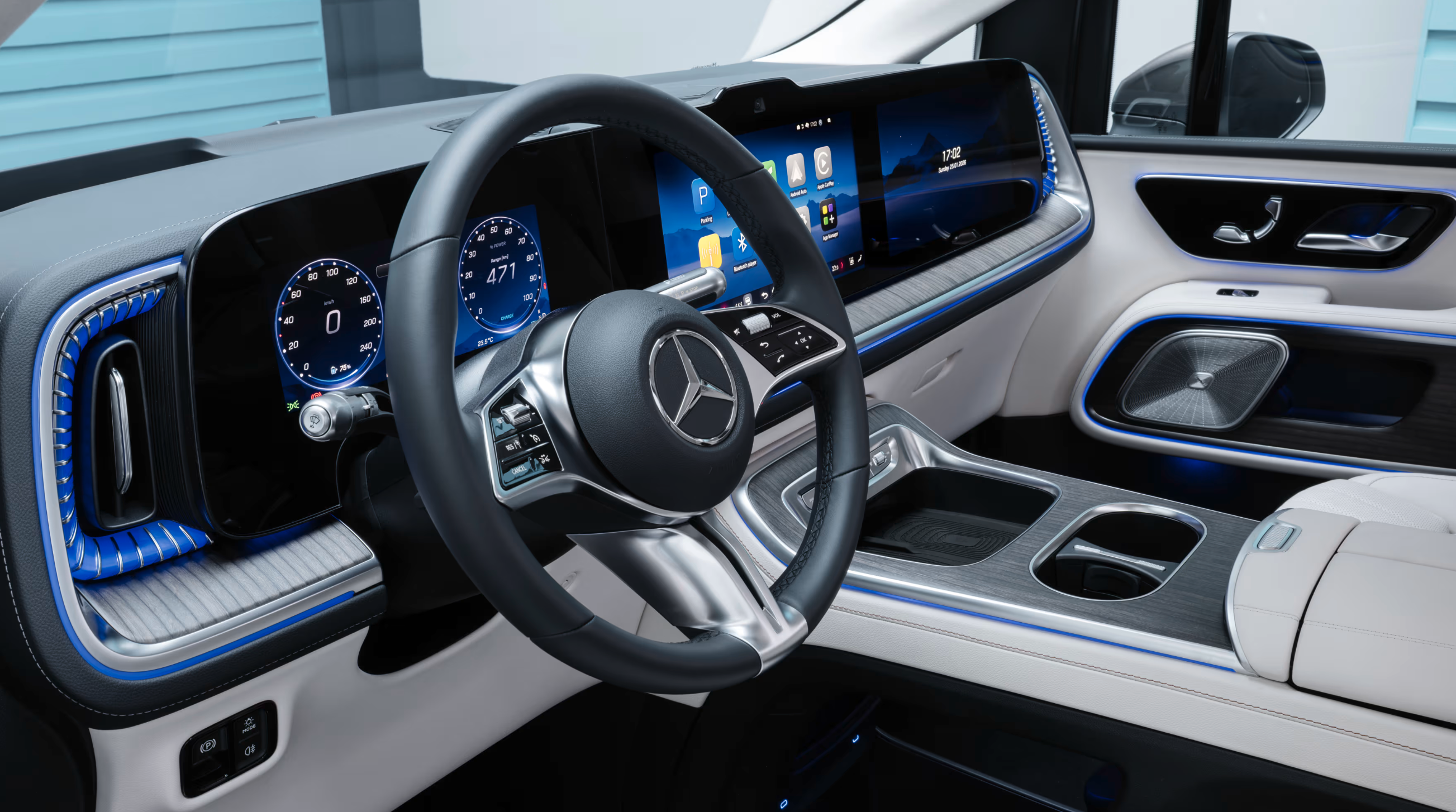 Pe interior, regăsim sistemul MBUX Superscreen, care se întinde pe toată lățimea planșei de bord și include un display digital pentru instrumentar de 10.25 inch, un ecran central de 14 inch și un ecran de 14 inch pentru pasagerul din față.
