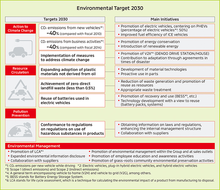 „Mitsubishi și-a setat obiective specifice pentru următorii 10 ani în cadrul eforturilor sale de a combate schimbările climatice și de a contribui la realizarea unei societăți cu emisii nete de CO2 zero până în 2050. Potrivit acestora, se prevede reducerea emisiilor de CO2 de la mașinile noi cu 40% față de anul fiscal 2010, reducerea emisiile de CO2 din activitățile de afaceri ale Mitsubishi cu 40% comparativ cu anul fiscal 2014 și creșterea proporției vehiculelor electrice în totalul vânzărilor la 50% până în 2030.