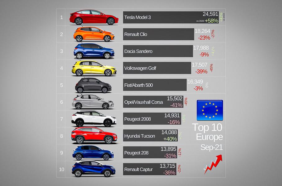 În același timp, Tesla Model 3 se regăsește nici printre primele 10 cele mai populare modele din Europa în primele 9 luni ale lui 2021. În acest clasament, pe primele trei locuri sunt ocupate de: Volkswagen Golf (176.061 mașini), Toyota Yaris (157.240 unități) și de Dacia Sandero (148.523 de exemplare).