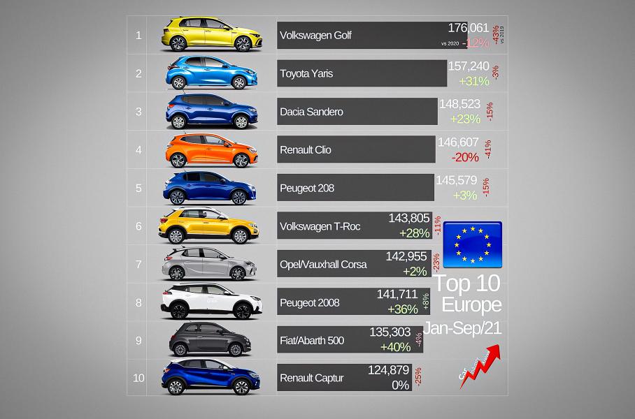 Pentru comparație: luna trecută, europenii au înregistrat 18.264 de exemplare Renault Clio, care ocupă locul doi cu o scădere de -23% față de septembrie 2020 și -27% față de septembrie 2019. Dacia Sandero care a devenit celebră în Europa, a fost livrată într-un număr de 17.988 de exemplare în prima lună de toamnă a acestui an, în scădere cu -9% față de aceeași perioadă a anului 2020, și în creștere cu 41% față de septembrie 2019.