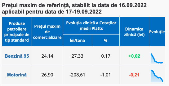 Așadar, motorina se va ieftini la miezul nopții cu 21 de bani și se va comercializa cu cel mult 26.90 lei per litru. În același timp, benzina se scumpește cu 2 bani și va avea un preț maxim de 24.14 lei per litru!
