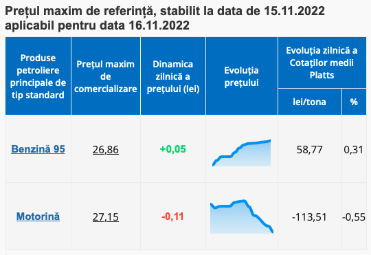 Astfel, benzina se scumpește cu încă 5 bani și se va comercializa cu cel mult 26.86 lei per litru, în timp ce motorina se ieftinește cu 11 bani și va avea un preț maxim de 27.15 lei per litru!