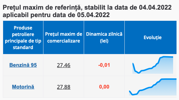 Câteva minute în urmă, ANRE a publicat noile prețuri plafon valabile pentru ziua de mâine. Astfel, benzina se ieftinește practic insesizabil cu doar 1 ban și ajunge să coste maxim 27.46 lei, în timp ce motorina își păstrează prețul indicat vinderi de 27.88 lei.