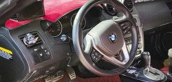 Însă modificările nu au afectat doar exteriorul mașinii. La interior a fost instalat un volan multifuncțional împrumutat de pe un model BMW, care integrează și logo-ul M. Pe planșa de bord acoperită cu o bucată de catifea roz a fost lipit abțibildul M Performance, pentru a accentua intențiile proprietarului de a transforma Hyundai-ul într-un coupe cu accente bavareze.