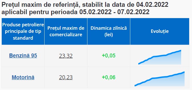 Astfel, începând cu ziua de mâine, 5 februarie, și până luni, 7 februarie, ANRE a stabilit un preț maxim de 23.32 lei pentru un litru de bezină standard A95 și 20.23 lei pentru un litru de motorină. Tariful pentru benzină s-a majorat cu 5 bani, în timp ce tariful pentru motorină a crescut cu 6 bani.
