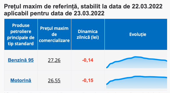 Astfel, prețul benzinei scade cu 14 bani și ajunge la pragul de 27.26 lei, în timp ce motorina se ieftinește cu 15 bani și se va comercializa la benzinării cu maxim 26.55 lei.