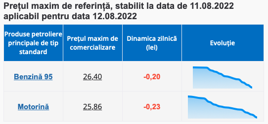 Așadar, Agenția anunță că mâine, 12 august, benzina se va ieftini cu 20 de bani și va ajunge să coste nu mai mult de 26.40 lei, în timp ce motorina scade din preț 23 de bani și se va vinde la pompă cu maxim 25.86 lei.