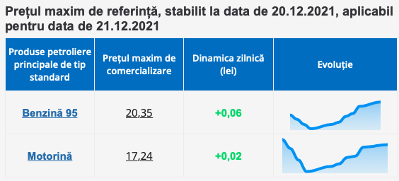 Așadar, Agenția anunță pentru ziua de mâine 21 decembrie, un preț mai mare cu 6 bani pentru benzină, care se va vinde cu maxim 20.35 lei, în timp ce motorina se scumpește cu 2 bani și se va comercializa nu mai scump de 17.24 lei.