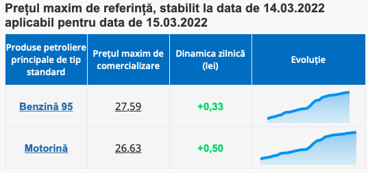 Astfel, pentru mâine 15 martie, este indicată o scumpire a benzinei cu 33 de bani, care ajunge să fie comercializată cu 27.59 lei, în timp ce motorina plusează la preț 50 de bani și se va vinde la stațiile PECO cu maxim 26.63 lei.