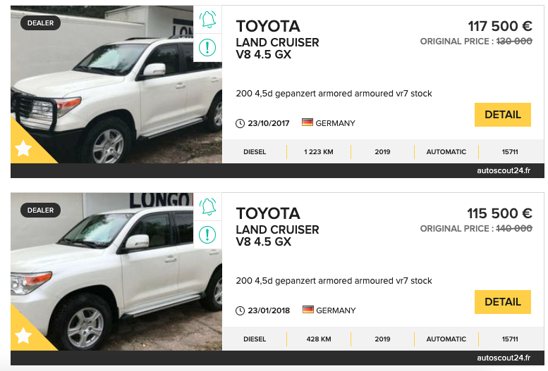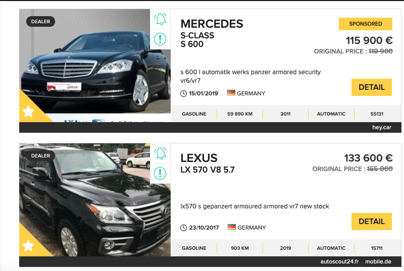 Așa că am deschis Google, am dat la căutare ”used armoured vehicles” și de aici au apărut și ofertele. Am ales cele mai indexate site-uri pentru asta, ele fiind probabil și cele mai populare, iar stocul găsit m-a surprins. De la limuzine și SUV-uri, până la tehnică de armată și mașini comerciale. Deci ai de unde alege, acuma totul în funcție de banii care îi ai și cerințele în acest sens.