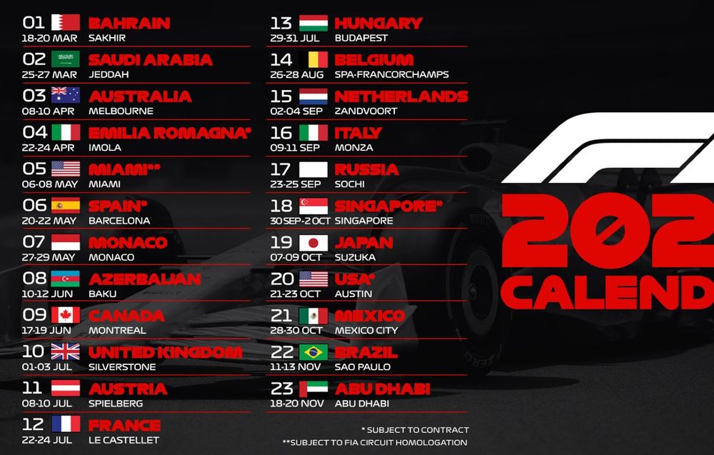 Prima cursă a sezonului va avea loc în Bahrain, ulterior va ajunge în Arabia Saudită, Australia și Italia. La începutul lunii mai ar trebui să aibă loc Marele Premiu de Formula 1 din Miami, cu condiția că circuitul va primi până atunci toate omologările necesare.