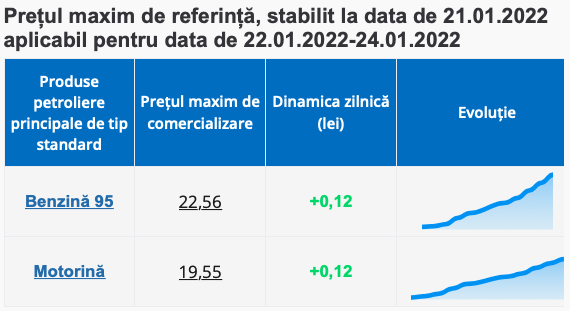 Așadar, pentru perioada 22-24 ianuarie, Agenția anunță o scumpire cu 12 bani a benzinei care va ajunge să coste 22.56 lei. Motorina, la fel adaugă la preț 12 bani și se va comercializa cu 19.55 lei.