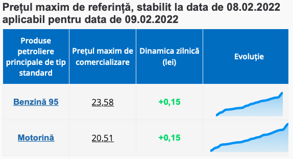 Astfel, potrivit ANRE, doar în ultimele 10 zile cotațiile Platts pentru produsele petroliere principale s-au majorat cu peste 50 $/tona și au depășit nivelul de 890 $/tona pentru benzină și 825 $/tona pentru motorină. În cadrul sesiunilor din săptămâna precedentă cotația petrolului Brent a depășit pragul de 93 $/baril, valoare înregistrată ultima dată în luna octombrie a anului 2014.