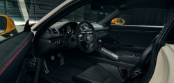 Noul Cayman are și câteva accente galbene: capacele oglinzilor, capotă, prizele de aer laterale, bara spate, eleronul și etrierele frânelor. Iar pe geamurile laterale din spate putem observa inscripția Porsche Exclusive Manufaktur și o emblemă 906-145, cu silueta modelului de curse.